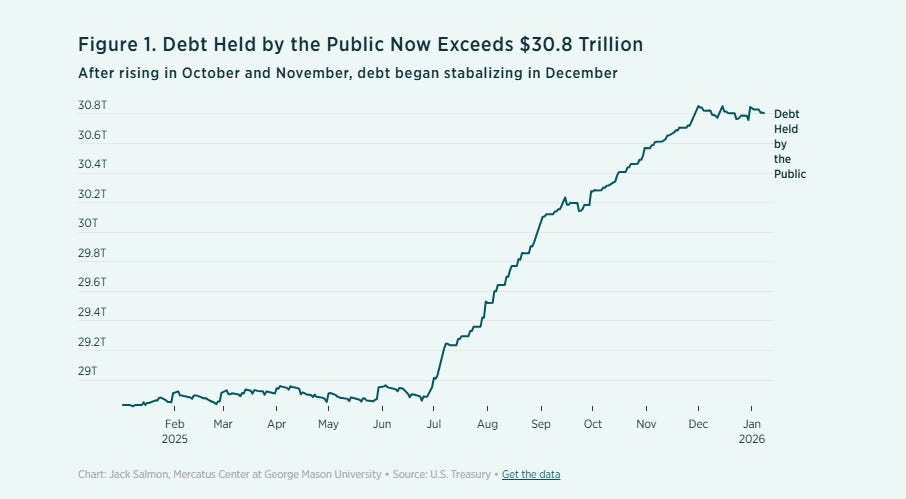 Debt held by public exceeds $30.8 trillion. Jack Salmon of the Mercatus Institute writes: “In December debt held by the public reached $30.8 trillion. This is an increase of a little over $2 trillion from the same time last year, or an increase of about $13,300 per federal taxpayer. […] As a share of gross domestic product (GDP), the public debt ratio is now 99%. This is the second-highest level on record (the highest level was in 1946 at 106%), and the Congressional Budget Office (CBO) forecasts our debt trajectory will reach a record high within the next three years.” Salmon emphasizes the consequences: “At this level of public debt, the US. economy forgoes almost 0.8 percentage points in potential economic growth based on a synthesis of nearly 200 estimates in the empirical literature.”