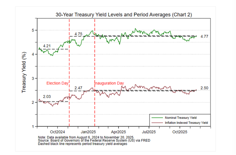Long-Term Treasury yield rise signals a failure to address budget pressures. AEI’s Mark J. Warshawsky writes: “All yields increased following President Trump’s election and remained higher, on average, following his inauguration. This is particularly clear for the 30-year yields [see figure below].” He explains the factors involved: “The tax cuts were only partially funded by Medicaid and other spending cuts. The cost of health care, financed in large part by the government, continues to rise, and there has been no substantive policy attention to the sector’s fundamental inefficiencies and poor incentives. Tariff policy, although producing revenue, is erratic and of questionable legality. Congress recklessly increased spending on Social Security benefits for some government workers and retirees, and the Administration just passed up on the long overdue opportunity to modernize and simplify the eligibility standards for disability benefits. Fewer immigrant workers mean higher wages in certain sectors like farming and construction, and therefore higher prices. The Administration has not issued a long-range budget plan and it is reported that it will support an extension of higher Obamacare subsidies.”