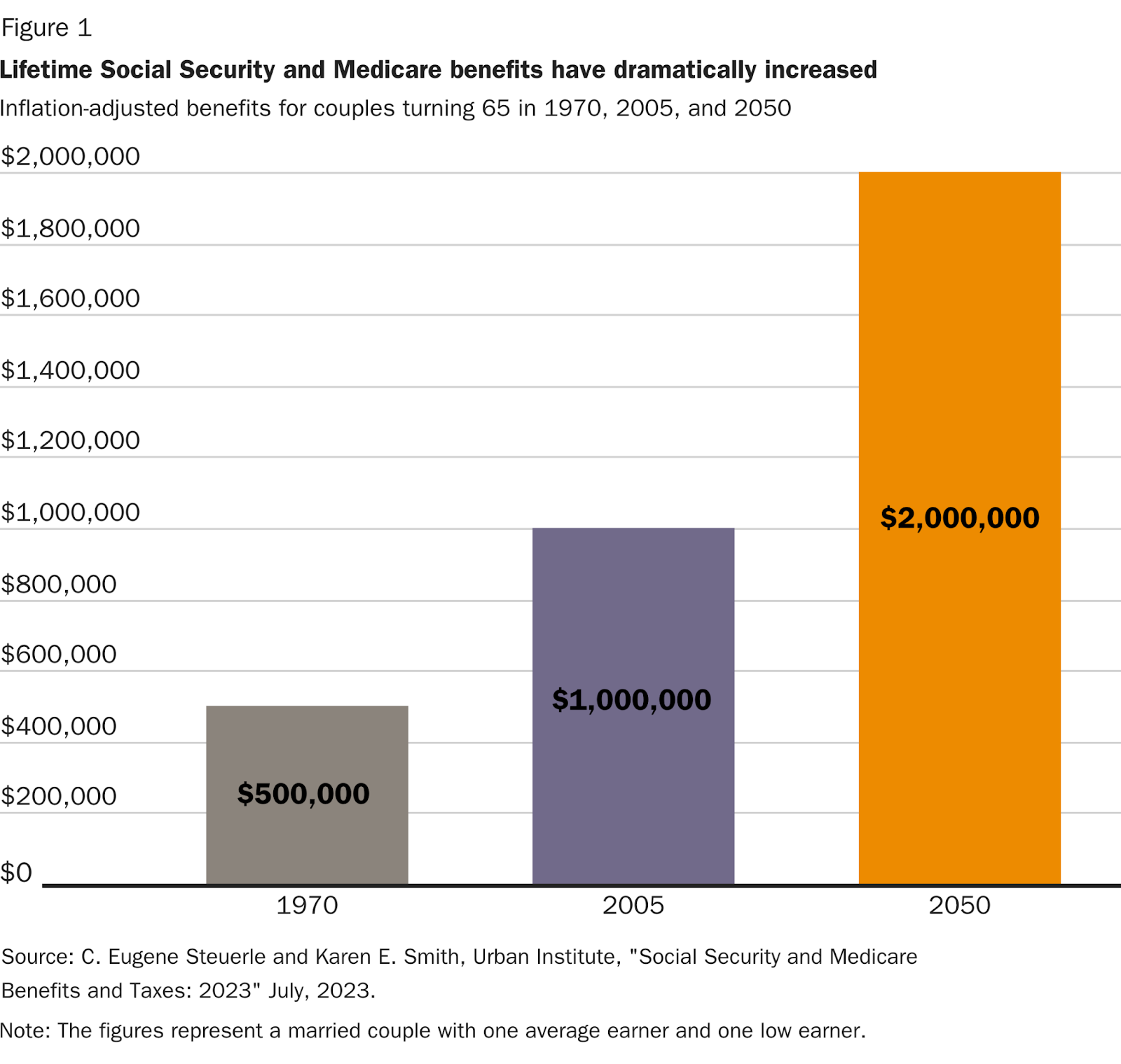 Medicare and Social Security spending is unsustainable. Eugene Steuerle, Richard B. Fisher Chair at the Urban Institute, notes that “[I]nflation-adjusted lifetime Social Security and Medicare benefits for a couple with average and low wages over their lives have grown from a bit over $500,000 for a couple turning 65 in 1970 to more than $1 million for a similar couple in 2005 and are scheduled to reach over $2 million in 2050 for a similar millennial couple aged 40 in 2025 [see the figure below].” This steep increase in the generosity of benefits is a significant driver of rising deficits and debt. Notably, Social Security and Medicare are responsible for 100 percent of US unfunded obligations over the next 75 years. Congress could solve most of the funding gap by freezing current benefits and only adjusting them for inflation. See this paper by John Cogan for further details.